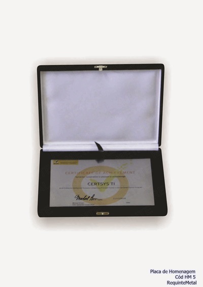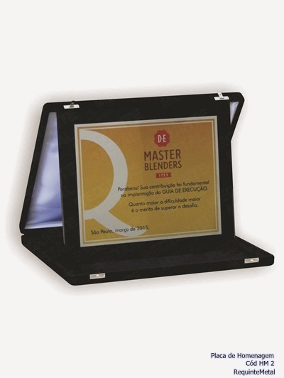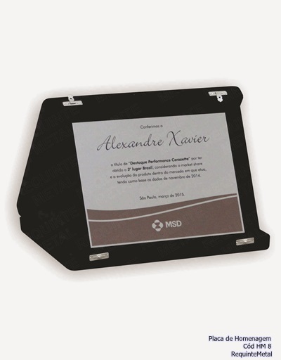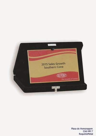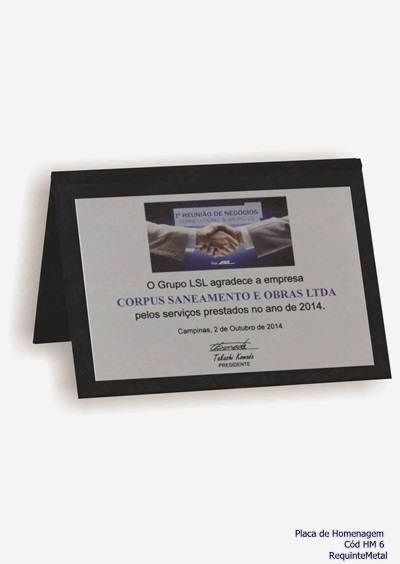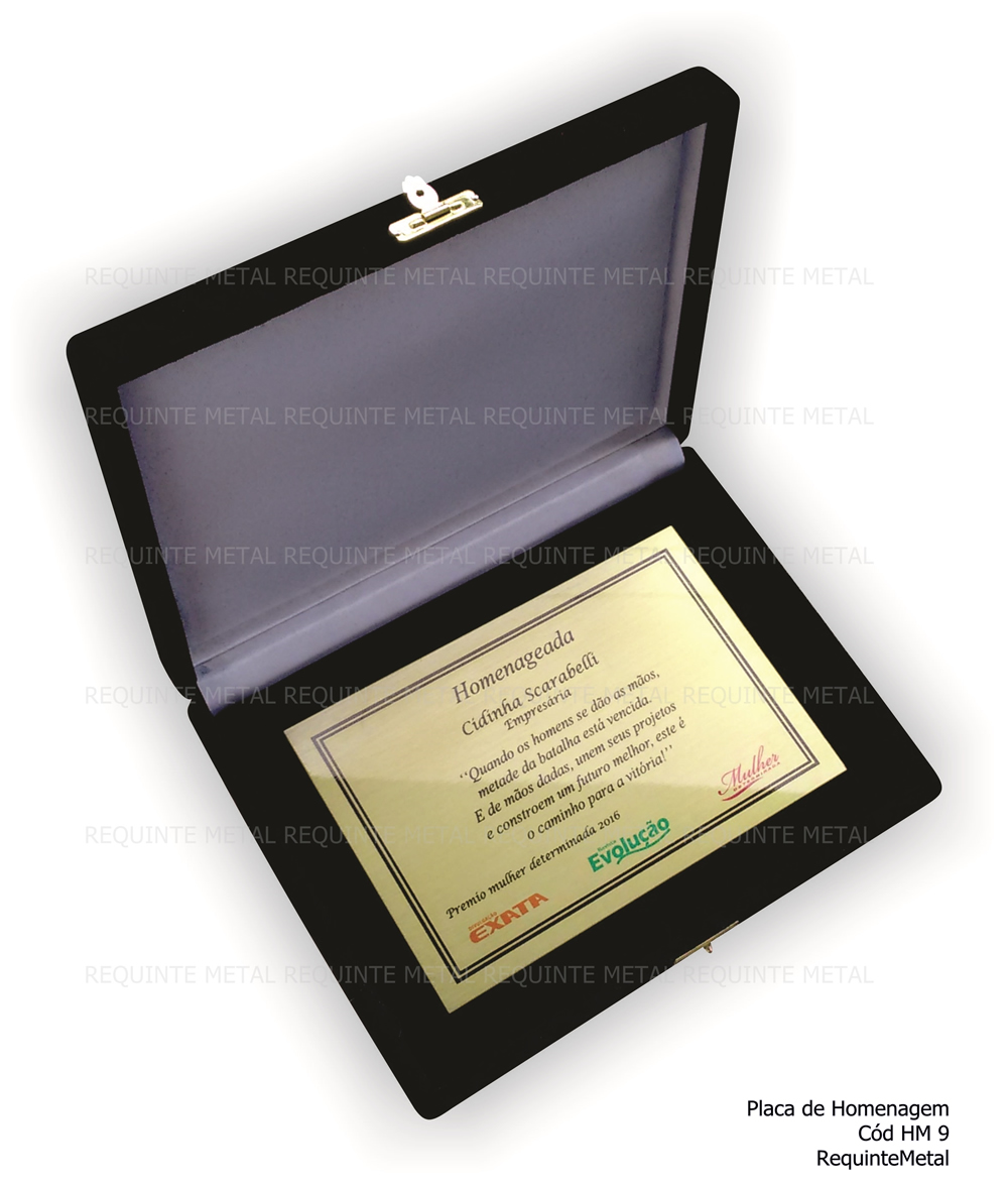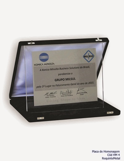 Nossas placas em aço inoxidável possuem verniz alto brilho, com gravação colorida e em alta definição, graças à tecnologia inovadora empregada em nossos processos. Estojos de luxo em veludo ou acrílico complementam a elegância que seu evento merece.